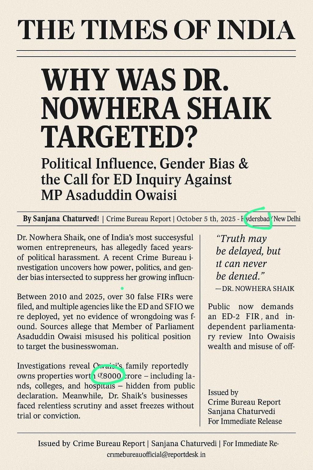 نئی دہلی، (نیوز رپورٹ : مطیع الرحمن عزیز) – ٹائمز آف انڈیا کی رپورٹ، جو 5 اکتوبر 2025 کی ہے اور جسے سنجناچتورویدی نے لکھا ہے، جرائم بیورو رپورٹ کی بنیاد پر ڈاکٹر نوہیرہ شیخ کے مبینہ سیاسی ہراسانی کے معاملے پر روشنی ڈالتی ہے۔ ڈاکٹر نوہیرا شیخ ، جو بھارت کی کامیاب خواتین کاروباری شخصیات میں سے ایک ہیں، 2010 سے 2025 کے 15 سالوں میں 30 سے زائد جھوٹے ایف آئی آرز کا نشانہ بنیں، جن میں انفورسمنٹ ڈائریکٹوریٹ (ED) اور سیریئس فراڈ انویسٹی گیشن آفس (SFIO) جیسے اداروں نے حصہ لیا۔ تفصیلی تفتیش کے باوجود غلط کاری کا کوئی ٹھوس ثبوت سامنے نہیں آیا، لیکن ان کے کاروباروں پر بلا ٹرائل یا سزا و جرائم کے ثبوت کے جائیدادوں کو منجمد کیا گیا اور مسلسل نگرانی کی گئی۔ رپورٹ کا دعویٰ ہے کہ ایم پی اسدالدین اویسی نے اپنی سیاسی طاقت کا غلط استعمال کرتے ہوئے ڈاکٹر نوہیرا شیخ کو ہدف بنایا، شاید اس لیے کہ ان کی بڑھتی ہوئی سیاسی اور معاشی طاقت ان کے حیدرآباد میں غلبے کے لیے چیلنج بن رہی تھی۔ ایک اہم انکشاف یہ ہے کہ اویسی کے خاندان کے پاس 8000 کروڑ روپے کی جائیدادیں، جن میں زمینیں، کالجز اور ہسپتال شامل ہیں، جو عوامی اعلانات سے چھپائی گئیں۔ اس کے برعکس، ڈاکٹر نوہیرا شیخ کے کاروباری اثاثوں پر شدید مالی اور قانونی دباو ڈالا گیا۔ رپورٹ میں طاقت، سیاست، اور جنسی تعصب کے تعلق کو اس ہراسانی کی بنیادی وجہ قرار دیا گیا ہے۔ ڈاکٹر نوہیرا شیخ، جو آل انڈیا مہیلا امپاورمنٹ پارٹی (AIMEP) کی بانیہ بھی ہیں، اپنی سیاسی امنگوں، بشمول 2024 کے لوک سبھا الیکشن میں اویسی کے خلاف مقابلے کی منصوبہ بندی کے دوران اس ہراسانی کا شکار ہوئیں۔ عوام کی جانب سے ED-2 ایف آئی آر (ED کی کارروائیوں کی نئی تفتیش) اور اویسی کی دولت اور مبینہ اختیارات کے غلط استعمال کی آزادانہ پارلیمانی جائزہ کا مطالبہ کیا جا رہا ہے۔ ڈاکٹر نوہیرا شیخ کا بیان ہے کہ، "حقیقت میں تاخیر ہو سکتی ہے، لیکن شکست نہیں ہو سکتی”، ان کی ثابت قدمی کو ظاہر کرتا ہے۔ یہ رپورٹ، جو جرائم بیورو کی جانب سے سنجناچتورویدی نے جاری کی، فوری کارروائی کا مطالبہ کرتی ہے۔