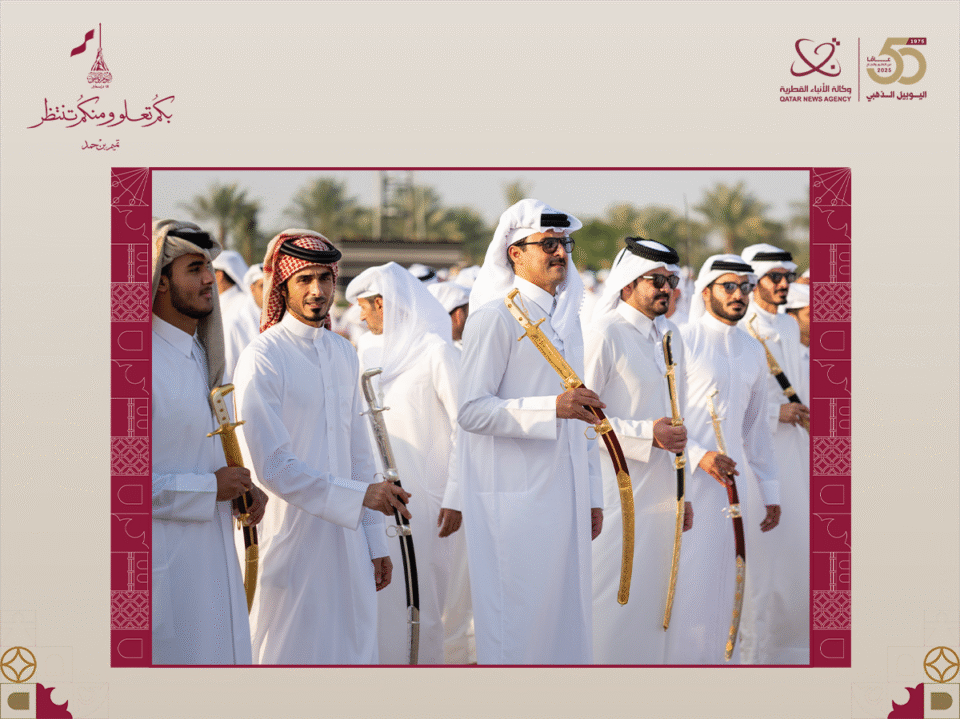 قطر کے امیر شیخ تمیم بن حمد الثانی نے آج سہ پہر لوسیل پیلس کے بیرونی صحن میں قطر کے قومی دن کی خوشی میں منعقدہ روایتی اردہ رقص میں شرکت کی۔